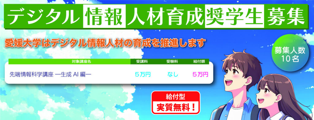 本機構では、「大学・高専機能強化支援事業(高度情報専門人材の確保に向けた機能強化に係る支援(支援2))」により定員増加が認められた学部・大学院におけるデジタル情報人材の育成、及び「愛媛県と国立大学法人愛媛大学のデジタル人材育成のための連携協定」による社会人リスキリングを主導的に実施します。