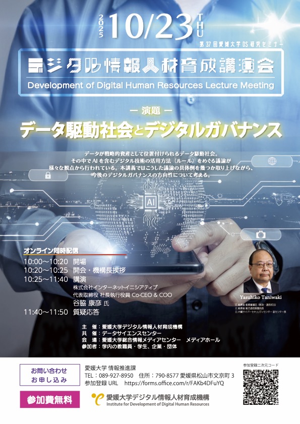 演題 | データ駆動社会とデジタルガバナンス データが戦略的資産として位置付けられるデータ駆動社会。 その中でAIを含むデジタル技術の活用方法(ルール)をめぐる議論が 様々な観点から行われている。 本講義ではこうした議論の具体例を幾つか取り上げながら、 今後のデジタルガバナンスの方向性について考える。 |